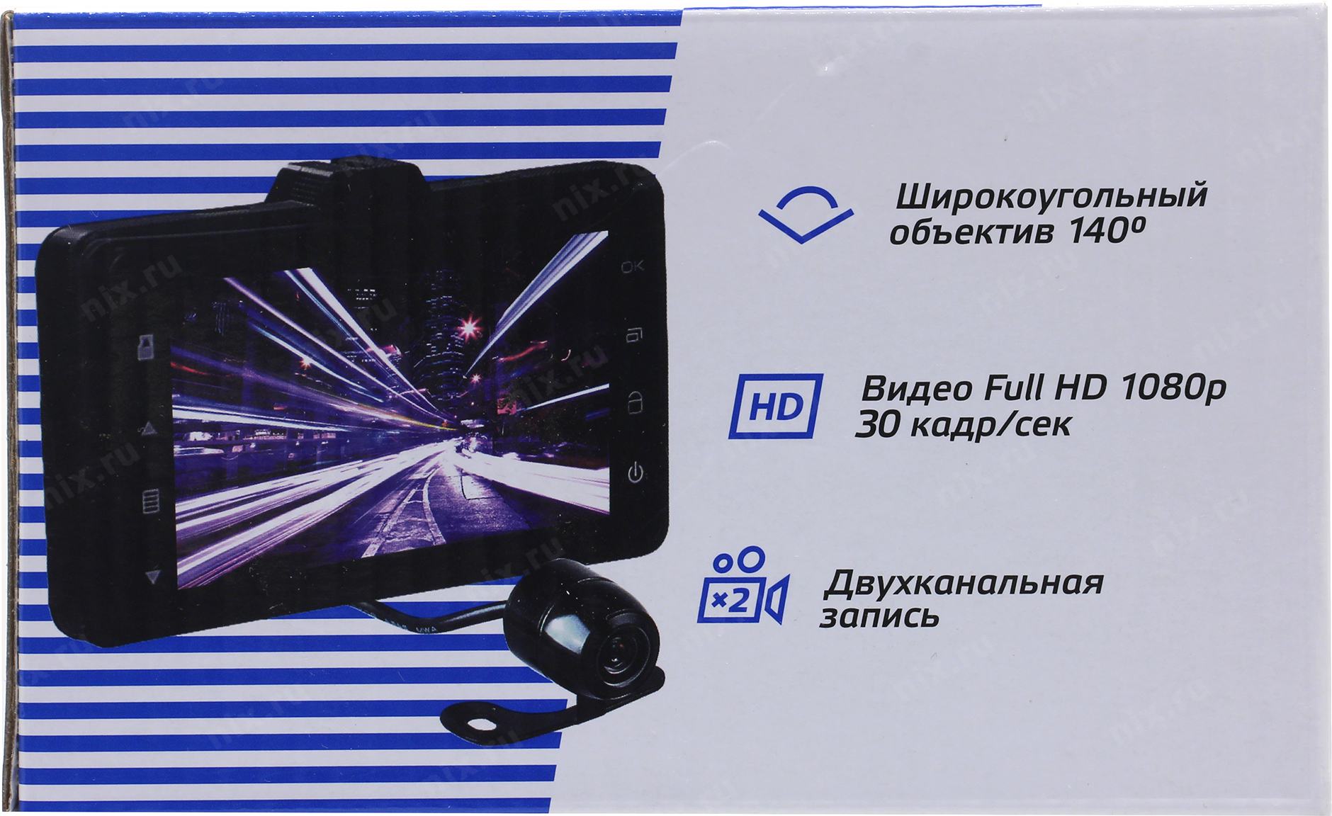 Двухканальное устройство которое имеет возможность обрабатывать картинку сразу с двух камер. Основная камера, установленная на лобовом стекле, охватывает обзор всей дороги впереди. Вторая камера устанавливается снаружи автомобиля для фиксации обстановки позади транспортного средства.