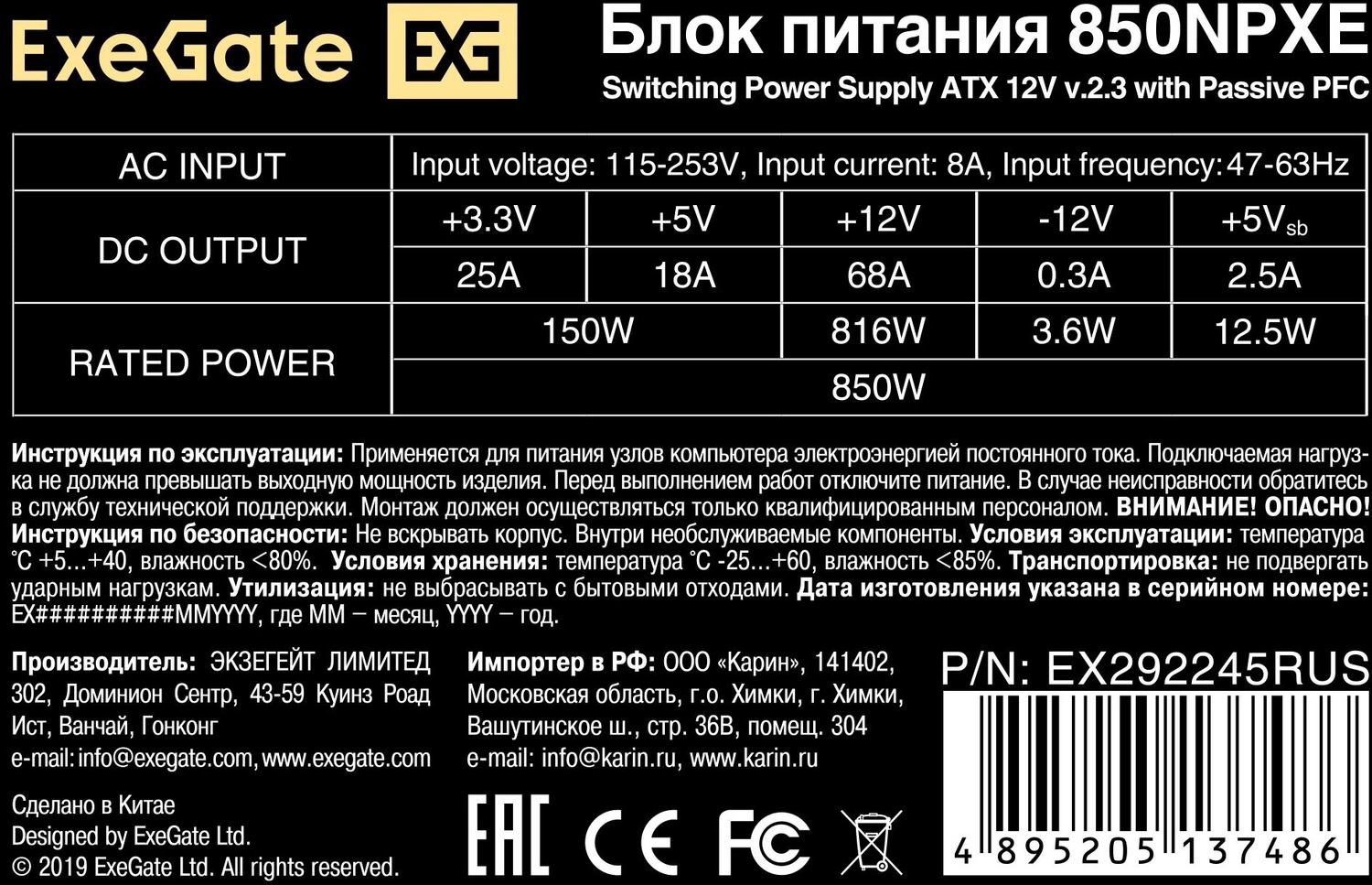 Блок питания Exegate ATX 850W 850NPXE (20+4pin) PPFC 120mm fan 5xSATA EX292245RUS-S