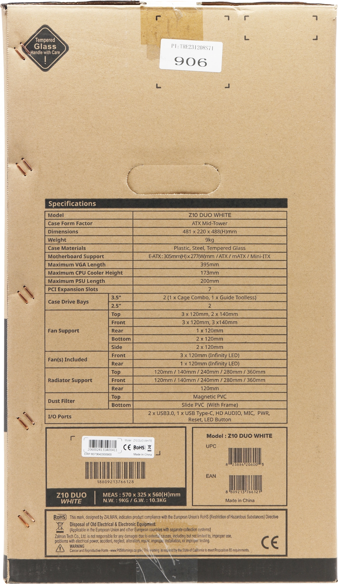 Корпус ZALMAN Z10 DUO White, ATX, WHITE, WINDOW, 2x3.5", 2x2.5", 2xUSB3.0, 1xUSB 3.1 Type-C, FRONT 3x120mm Infinity Mirror ARGB, REAR 1x120mm Infinity Mirror ARGB, replaceable front panel