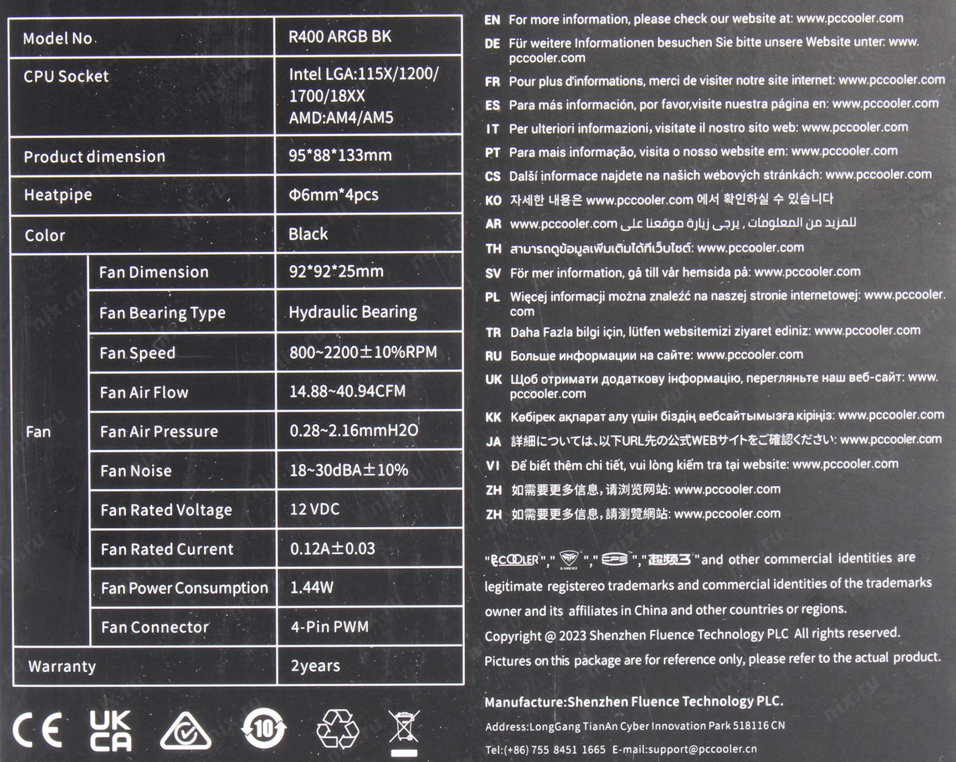 Устройство охлаждения(кулер) PcCooler R400 ARGB Soc-AM5/AM4/1200/1700/1851 черный 4-pin 18-30dB Al+Cu 180W Ret (R400-BKAWYX-US)
