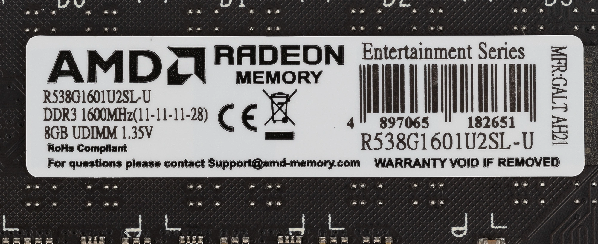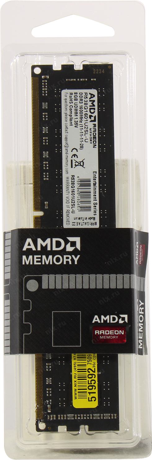 Модуль памяти AMD Radeon 8GB DDR3L 1600 DIMM R5 Entertainment Series Black R538G1601U2SL-U Non-ECC, CL11, 1.35V, R538G1601U2SL-U RTL (182651)