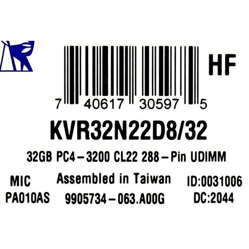 Модуль памяти Kingston KVR32N22D8/32 32GB DDR4 3200 DIMM Non-ECC, Unbuffered, CL22, 1.2V, 2Rx8, RTL (25), (305975)