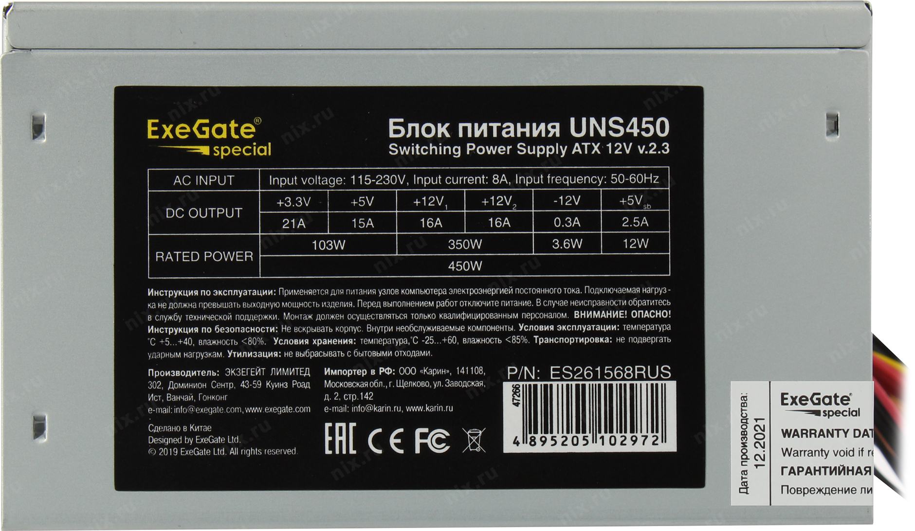 Блок питания Exegate ES261568RUS Блок питания 450W Exegate Special UNS450, ATX, 12cm fan, 24p+4p, 6/8p PCI-E, 3*SATA, 2*IDE, FDD