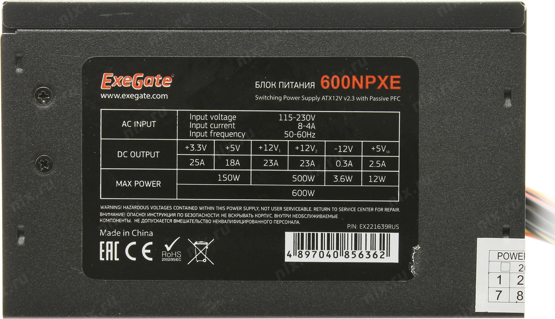 Блок питания Exegate EX221639RUS Блок питания 600W ATX-600NPXE(+PFC), black, 12cm fan, 24+(4+4)p, (6+2)p PCI-E, 3*SATA