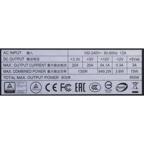 +3.3V - 20A, +5V - 20A, +12V - 54.1A, +5VSB - 3A, -12V - 0.3A;;;Комбинированная нагрузка: +3.3V&+5V - 130 Вт