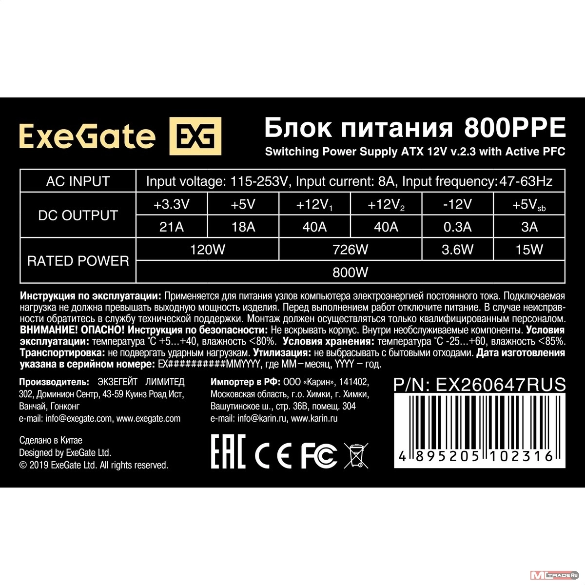 Блок питания Exegate EX260647RUS Блок питания 800W Exegate 800PPE, ATX, black, APFC, 12cm, 24p+(4+4)p, PCI-E, 3*IDE, 5*SATA, FDD OEM