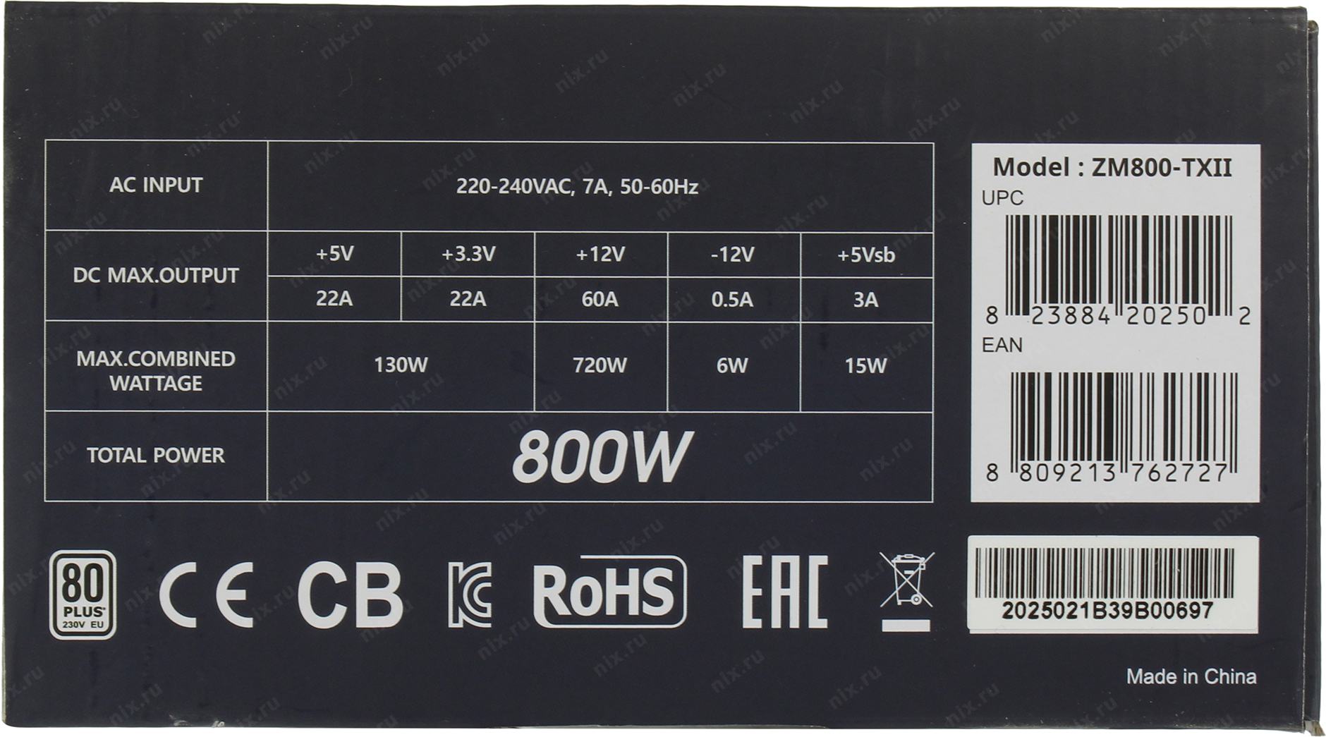 Блок питания Zalman ZM800-TXII, 800W, ATX12V v2.31, APFC, 12cm Fan, 80+ 230V EU, Retail
