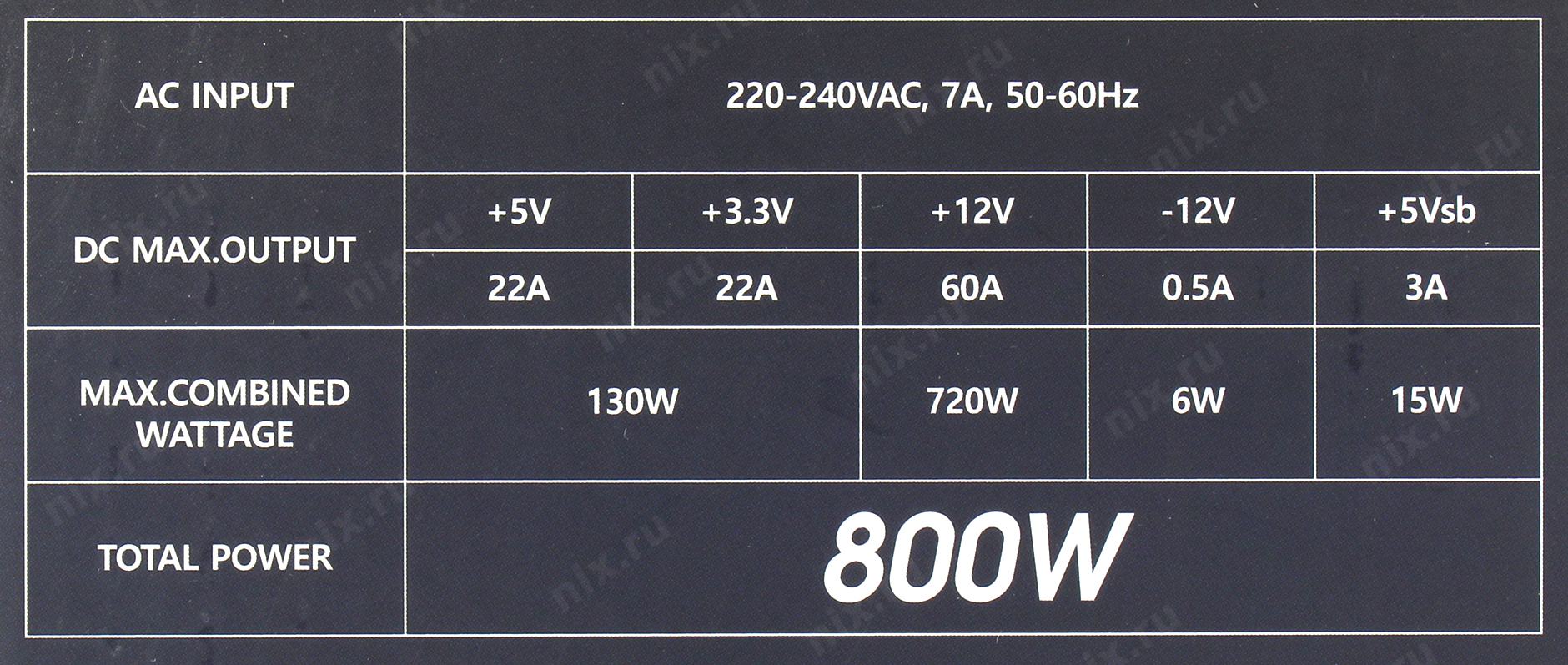 +3.3V - 22A, +5V - 22A, +12V - 52.5A, +5VSB - 3A, -12V - 0.5A ; Комбинированная нагрузка: +3.3V & +5V - 130 Вт