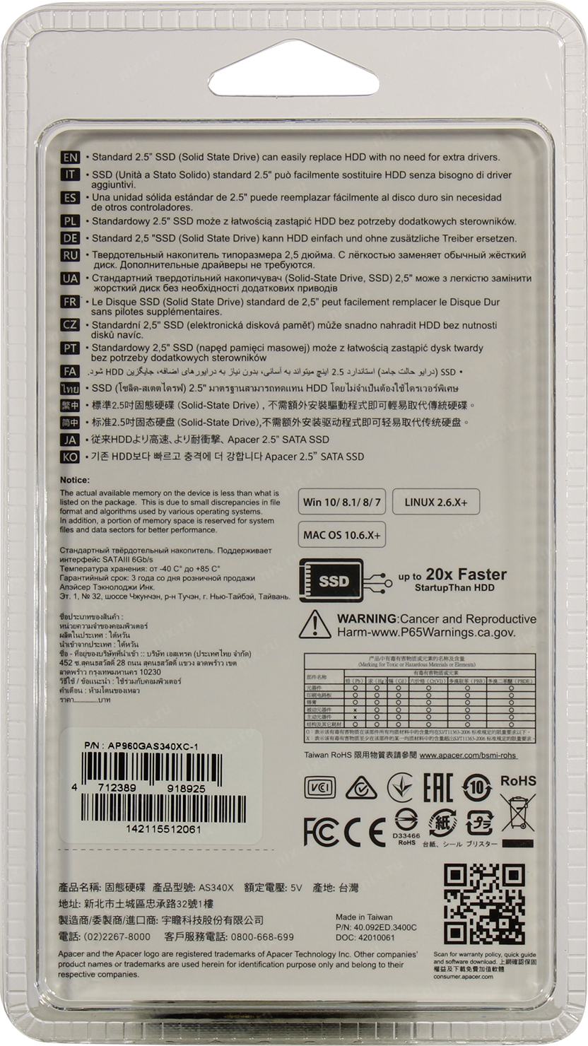 Твердотельный накопитель SSD Apacer AS340X AP960GAS340XC-1 960GB 2.5" Client SATA 6Gb/s, 550/510, IOPS 93/80K, MTBF 1.5M, 3 NAND, 560TBW, 0,53DWPD, RTL (918926) (918925)