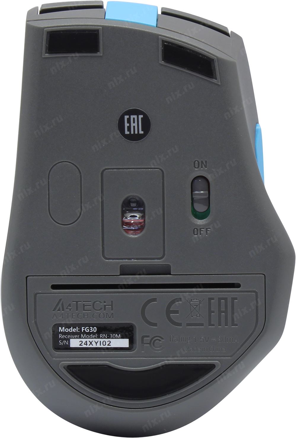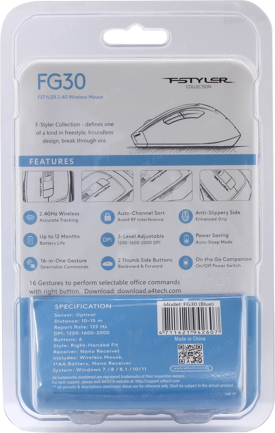 Мышь A4Tech Fstyler FG30 серый/синий оптическая 2000dpi беспров. USB 6but (FG30 BLUE)