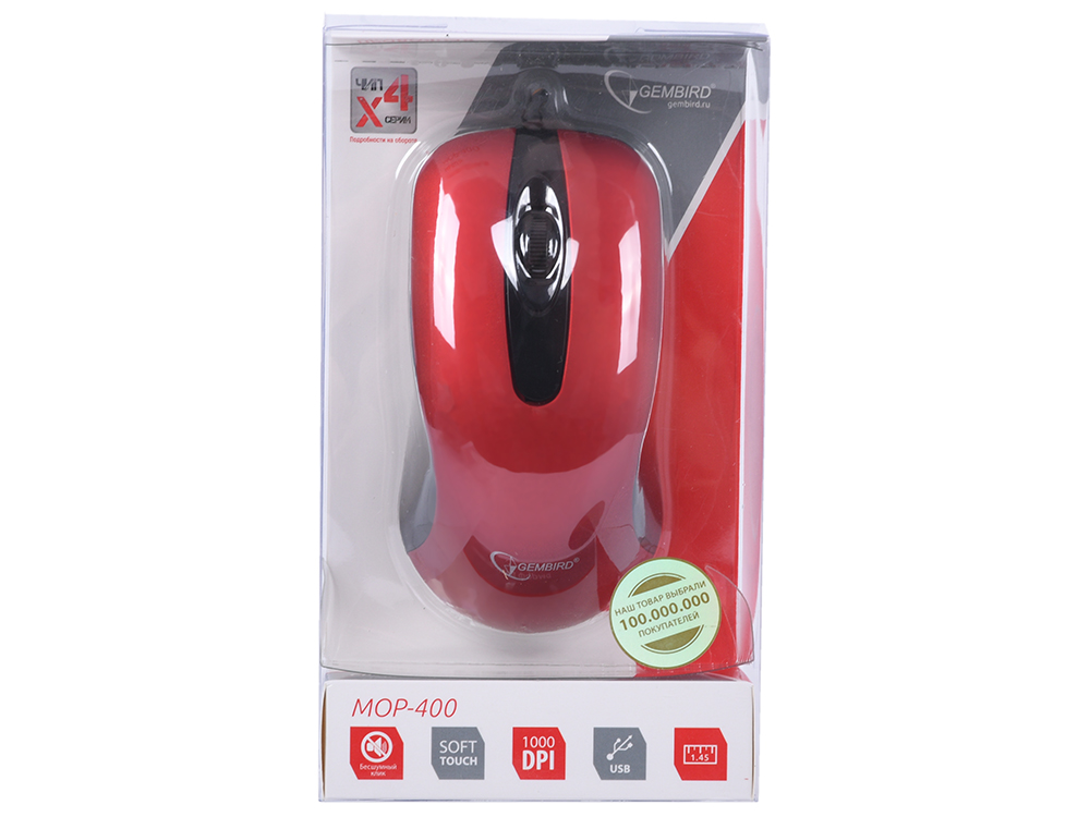 Мышь Gembird MOP-400-R красный USB (Мышь, бесшумный клик, 2 кнопки+колесо кнопка, 1000 DPI, soft-touch, кабель 1.45м, блистер)