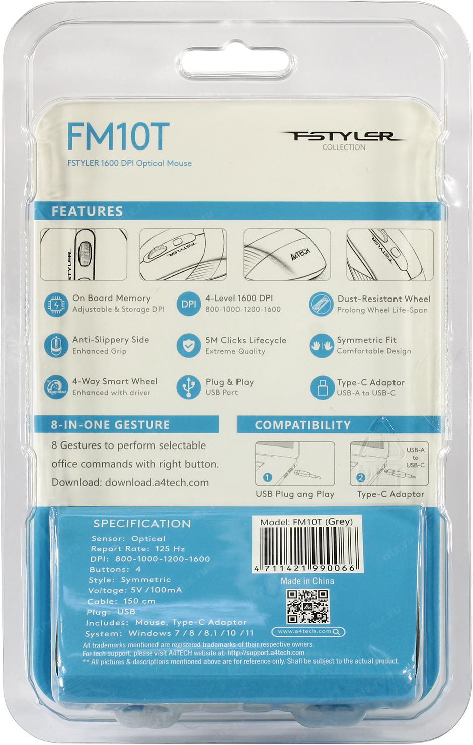 Мышь A4Tech Fstyler FM10T серый/черный оптическая 1600dpi USB для ноутбука 3but (FM10T GREY)