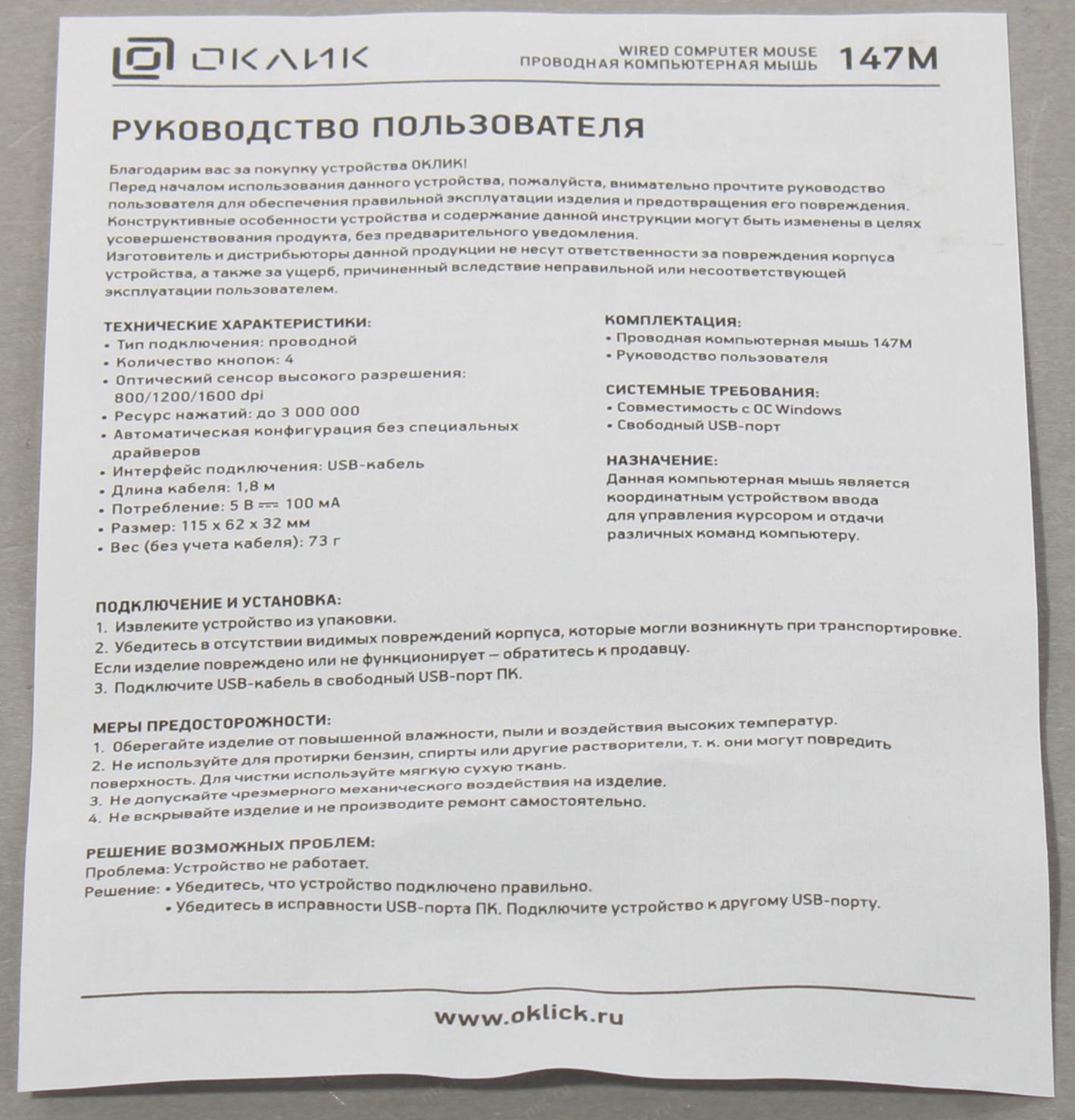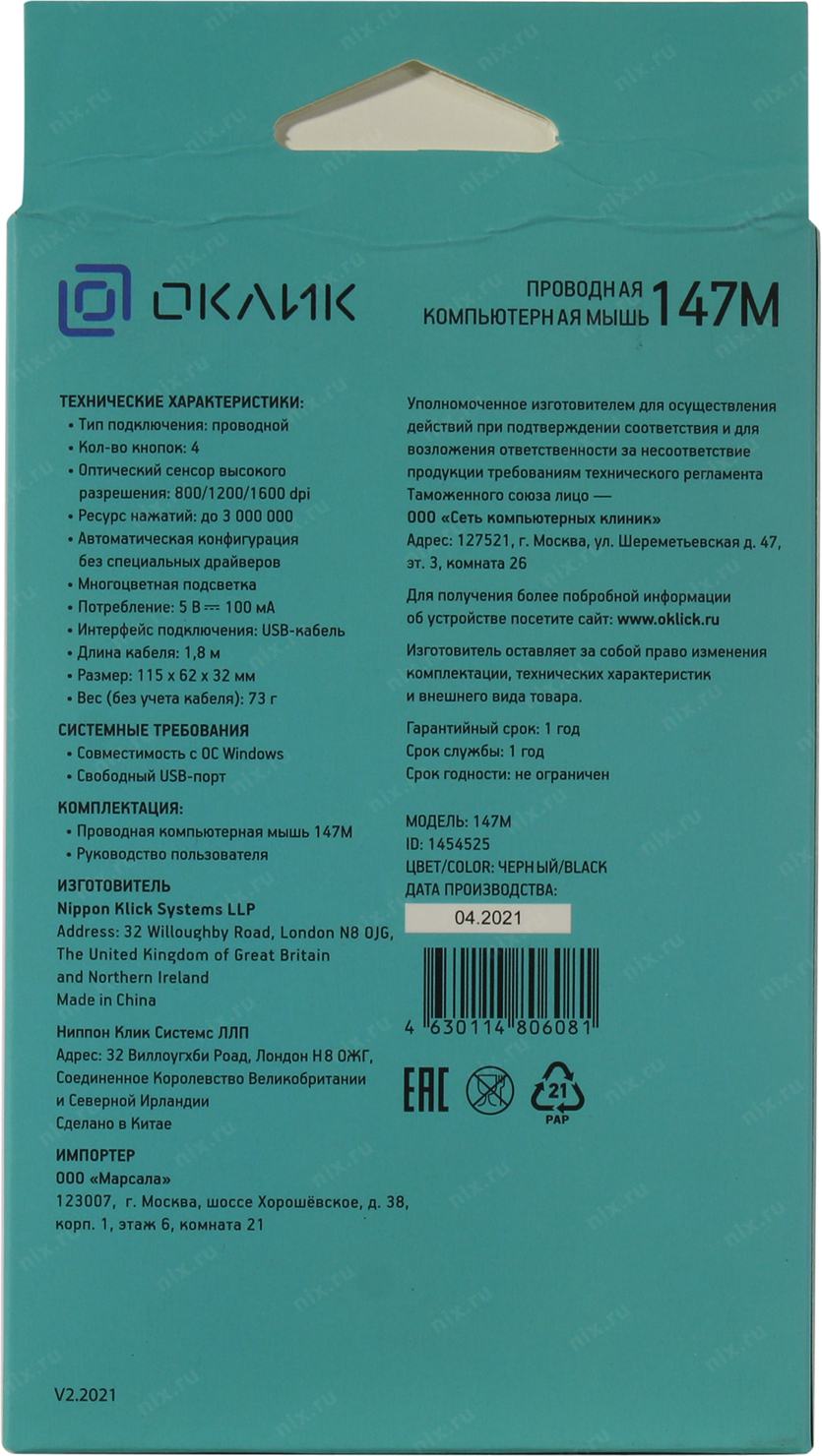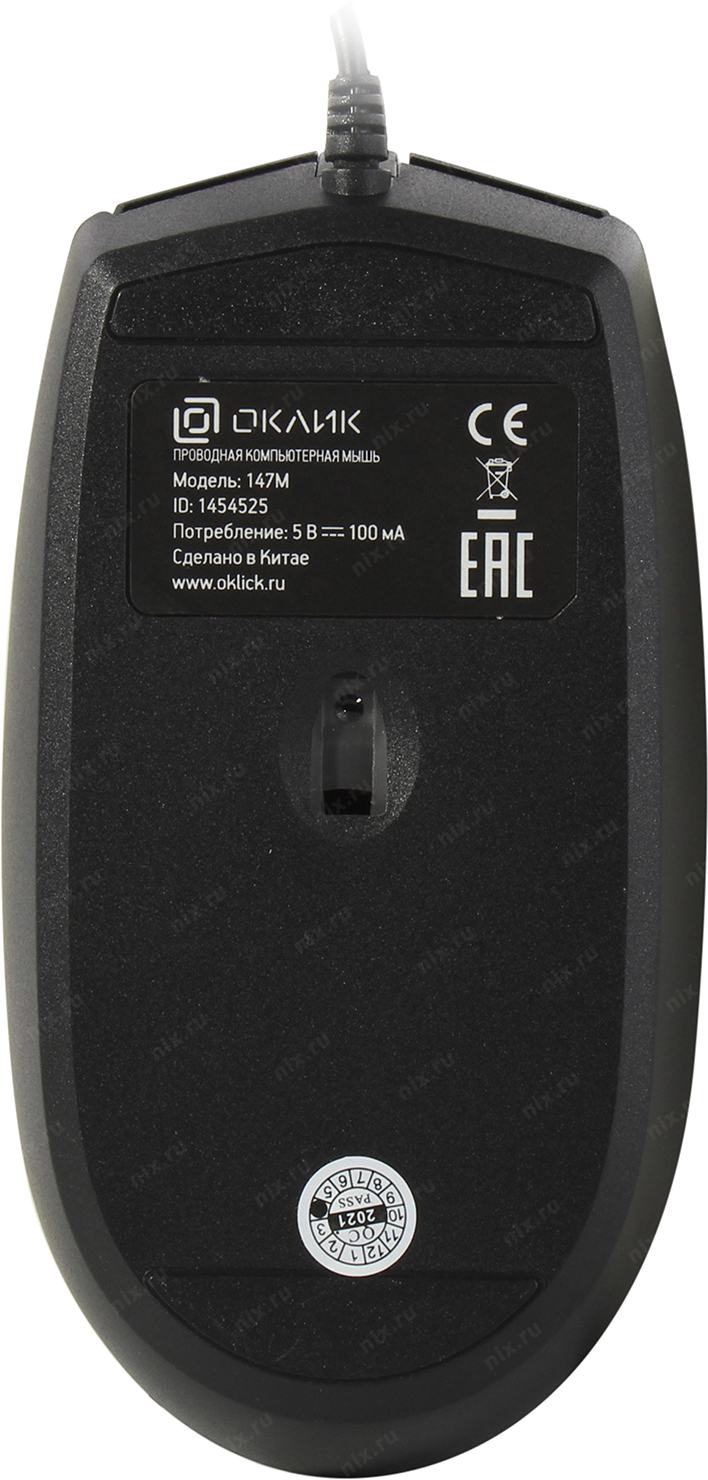 Мышь Oklick 147M черный оптическая (2000dpi) USB (4but) [1454525]