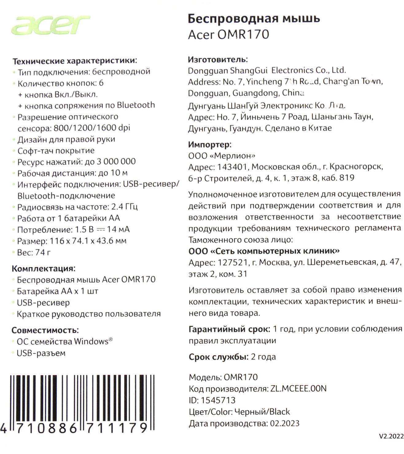 Acer OMR170 [ZL.MCEEE.00N] черный оптическая, беспроводная, USB
