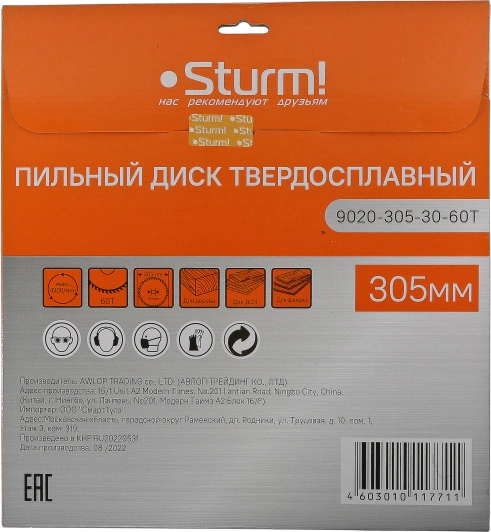 Диск пильный 305х30 мм, 60T Sturm 9020-305-30-60T применяется для продольного и поперечного распила мягкой и твердой древесины, фанеры, ДСП, ламината, пластика и плитных материалов.