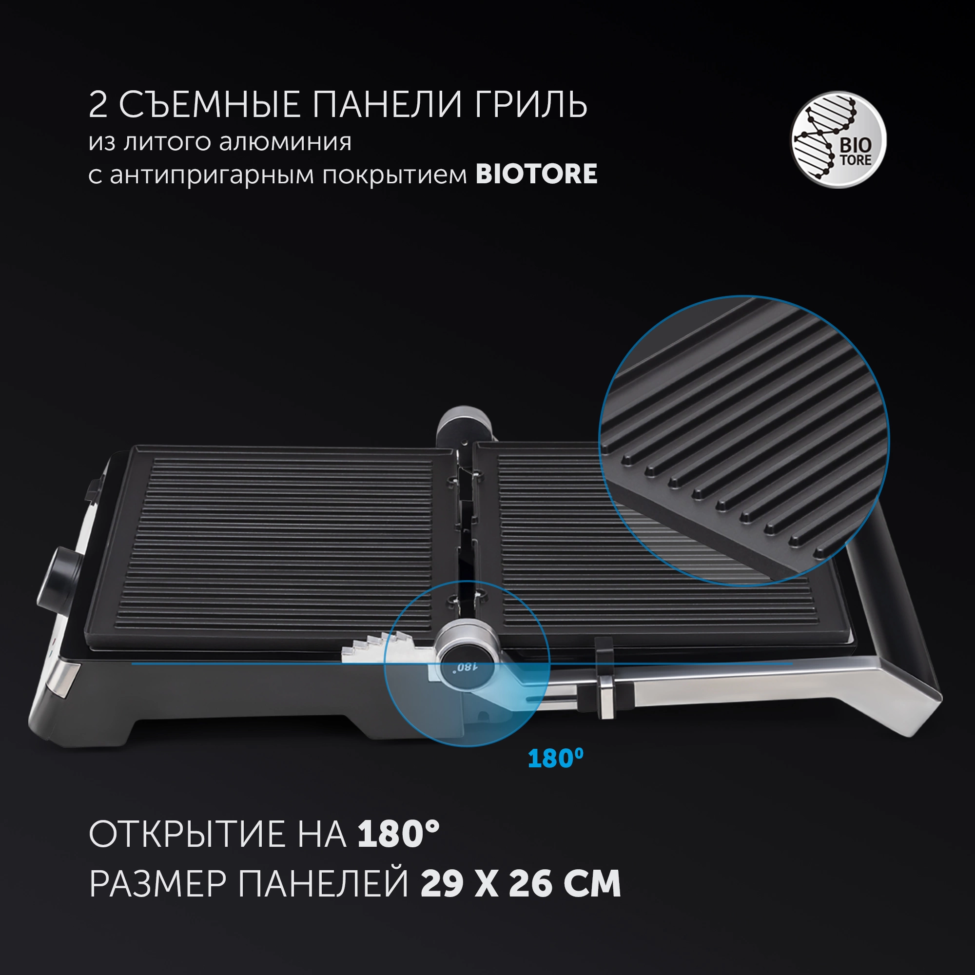 3 в 1: Гриль, Печь, Барбекю. 2 съемные панели с антипригарным покрытием BIOTORE. Плавная регулировка температуры. Возможность использования в открытом положении. Рабочие поверхности раскрываются на 180" . Рифленые панели способствуют равномерной прожарке.