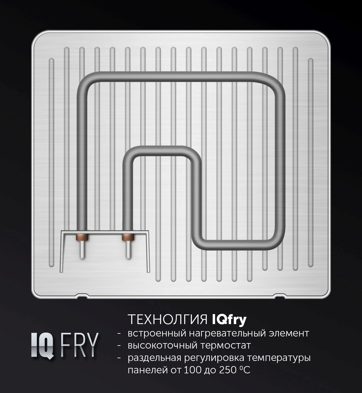 Технология IQfry встроенный в панель нагревательный элемент. Высокоточный термостат. Раздельная, плавная регулировка температуры верхней и нижней панелей. Возможность использования в открытом положении. Рабочие поверхности раскрываются на 180°.