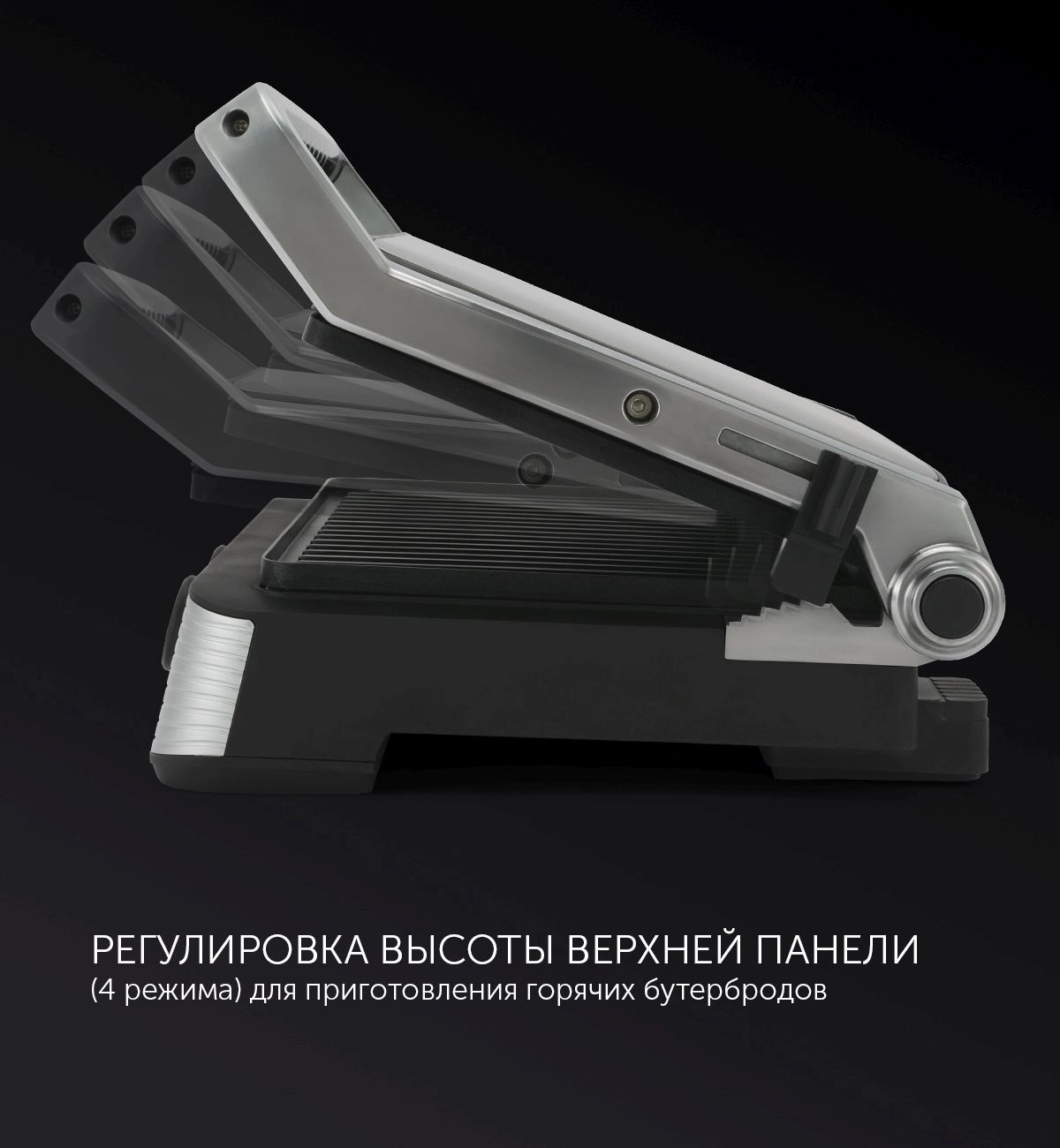 Регулировка высоты верхней панели (4 режима) - подходит для приготовления крупных стейков. 2 съемные панели с антипригарным покрытием. Рифлёные панели способствует равномерной прожарке.