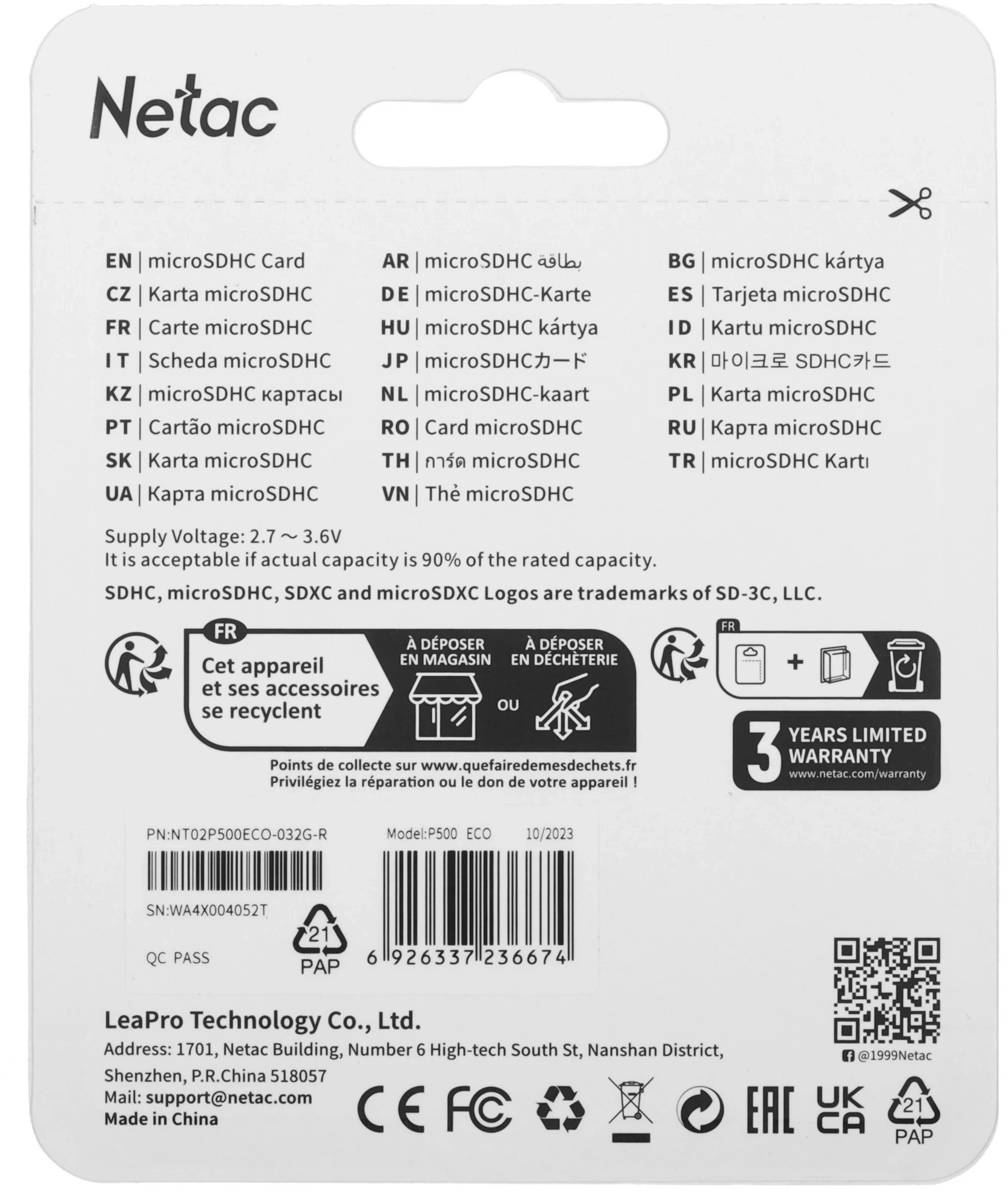 Карта памяти Micro SecureDigital 32GB Netac P500 ECO <NT02P500ECO-032G-R> (с SD адаптером)