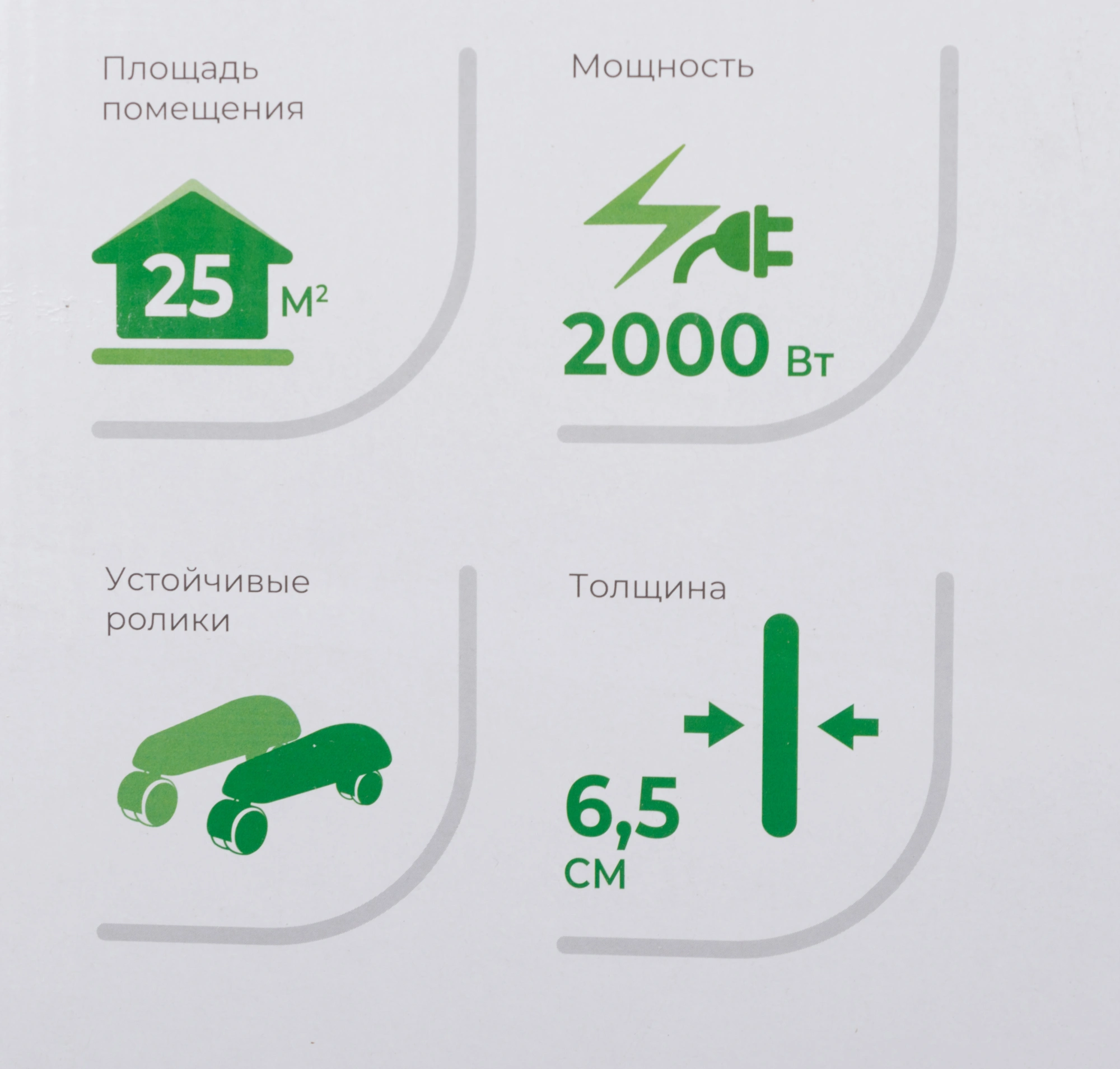Мгновенный разогрев за 10-20 секунд. Защита от просушивания воздуха и выжигания кислорода. Система безопасной эксплуатации Security Project. Отсутствие острых углов. Высококачественное порошковое покрытие, устойчивое к выцветанию и царапинам.