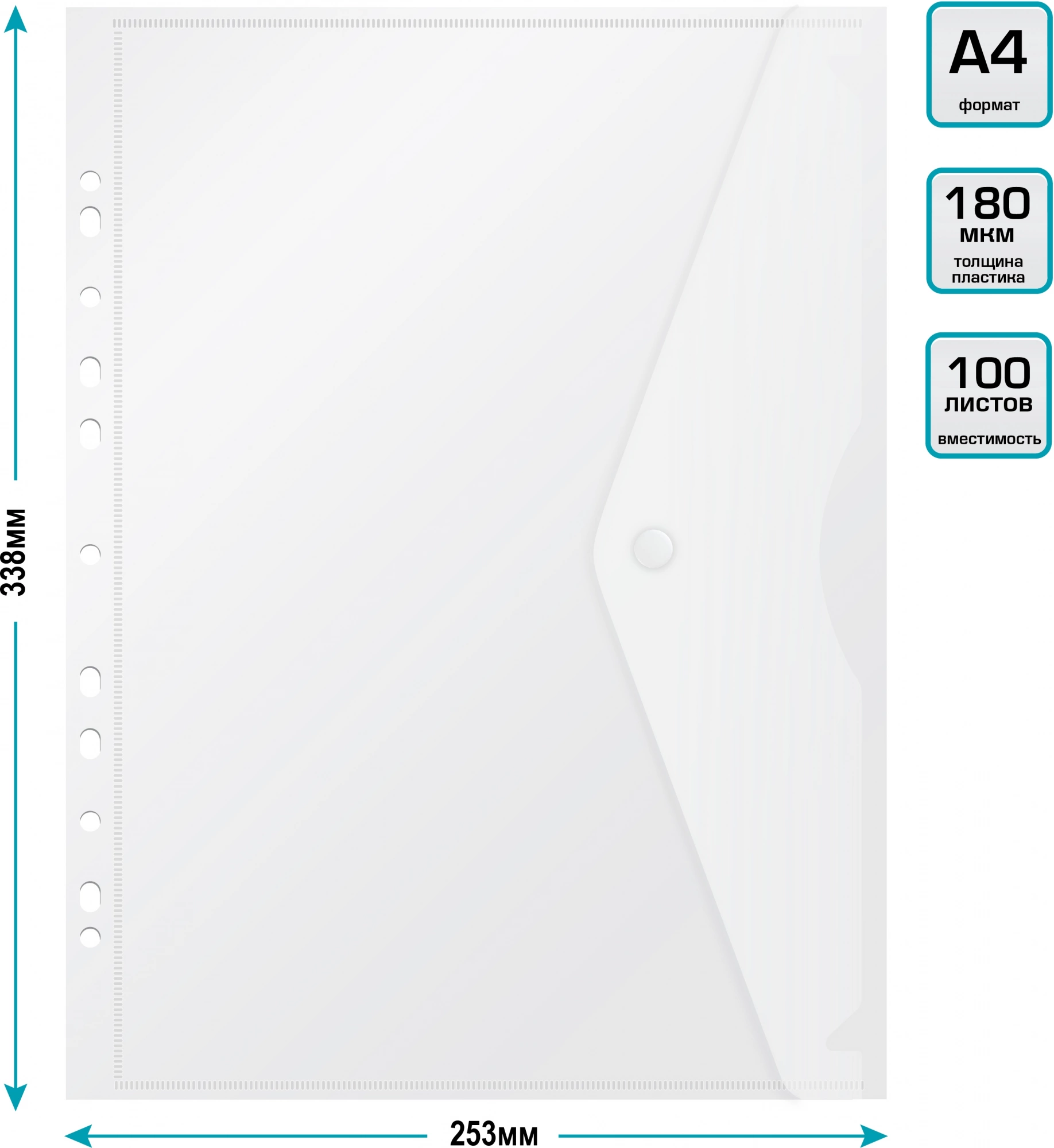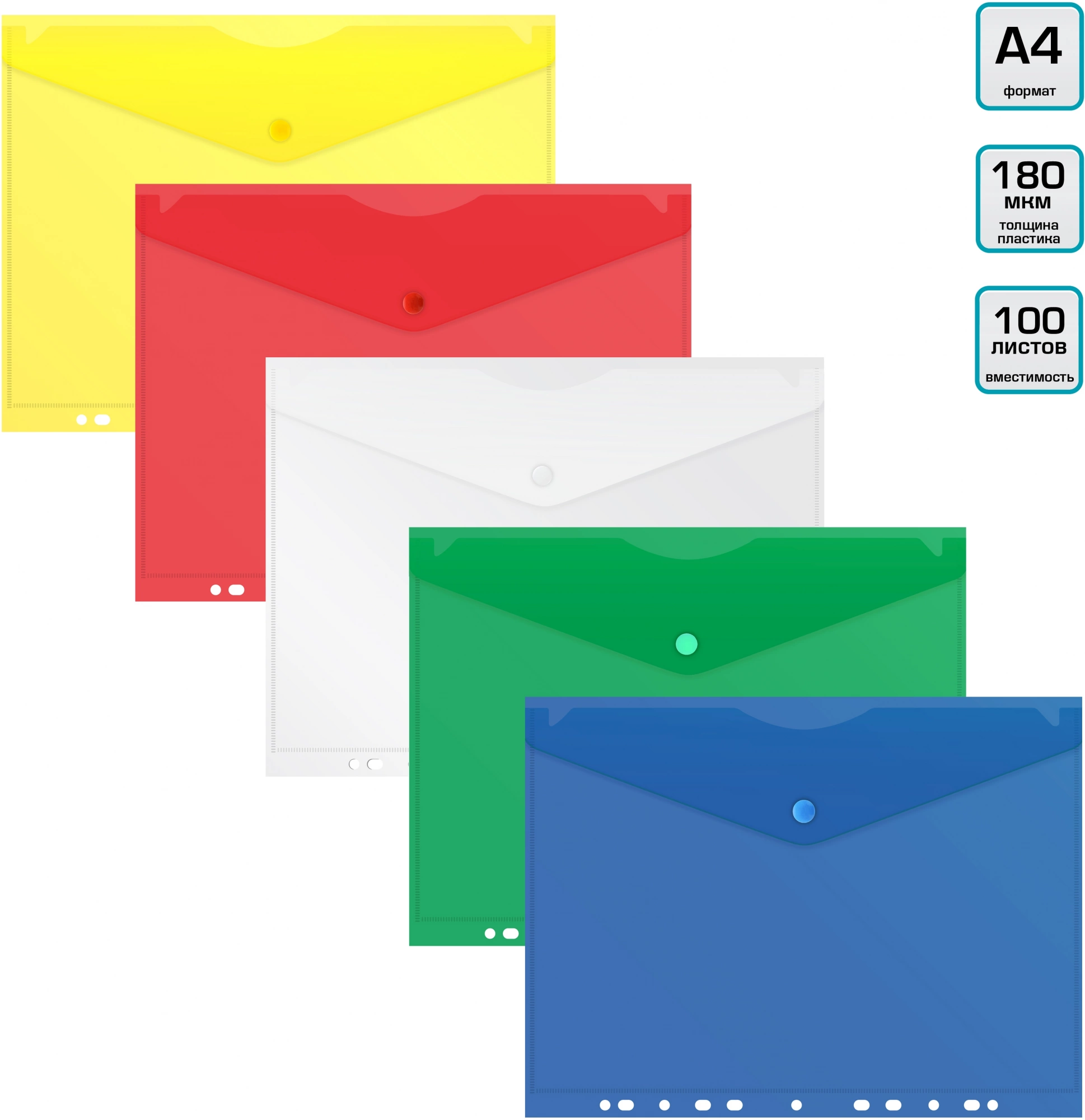 Конверт на кнопке Бюрократ -PK880 A4 с перфорац. по длинной стороне пластик 0.18мм ассорти (продается кратно 5 шт.)