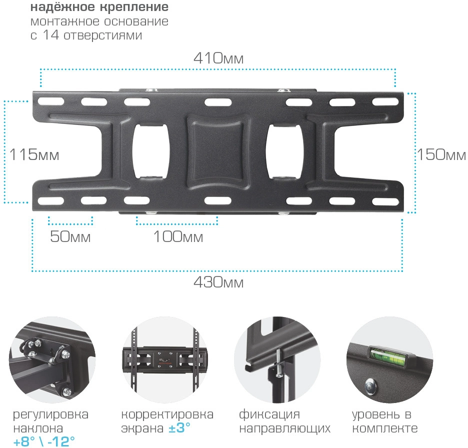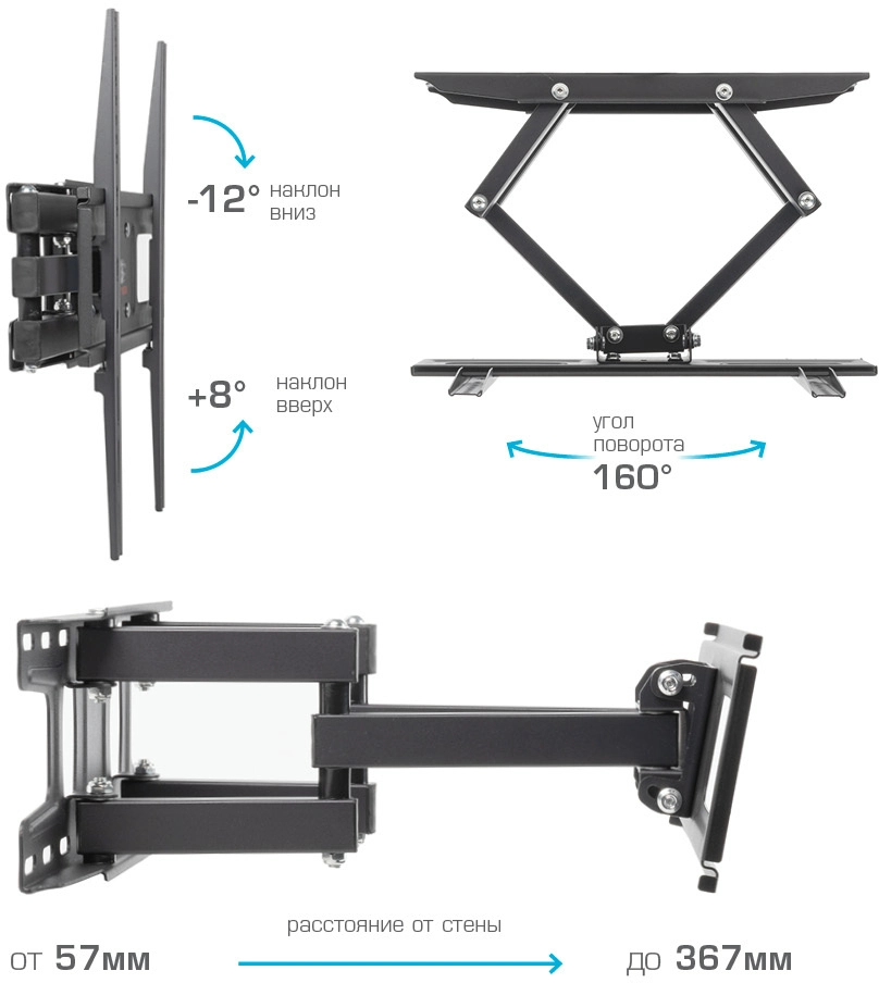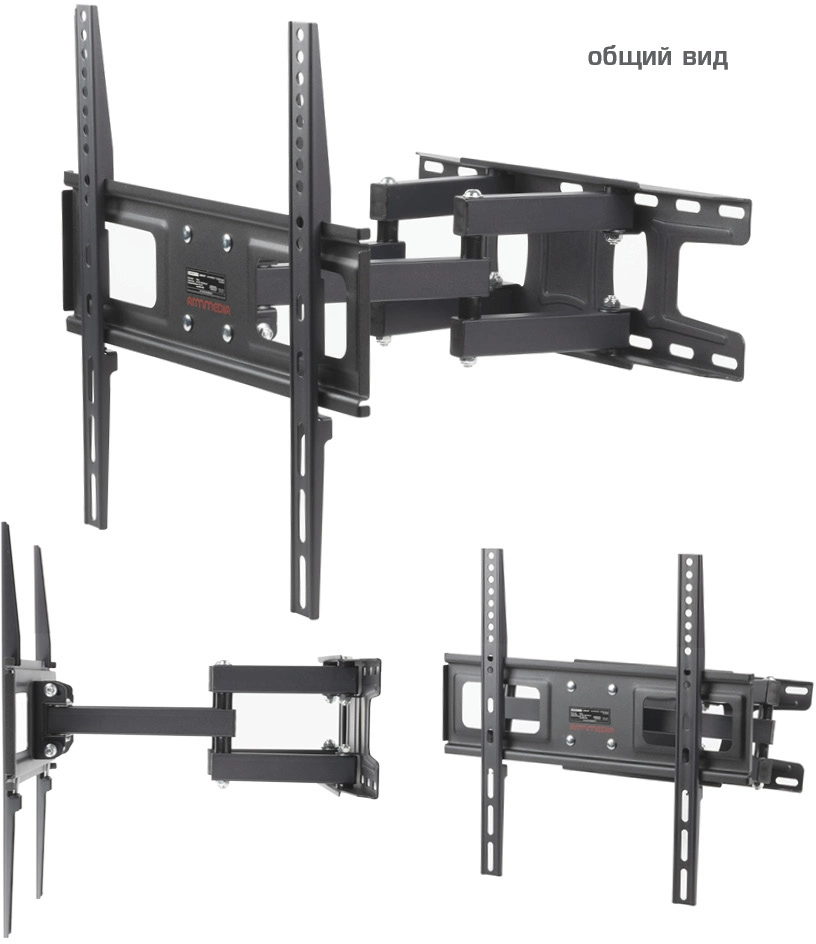 Универсальный - телевизор на кронштейне можно наклонить, повернуть и сдвинуть к стене. Легкий монтаж телевизора - благодаря наличию съемной монтажной пластины. Широкое настенное основание. Корректировка экрана ±3°. Водяной уровень.
