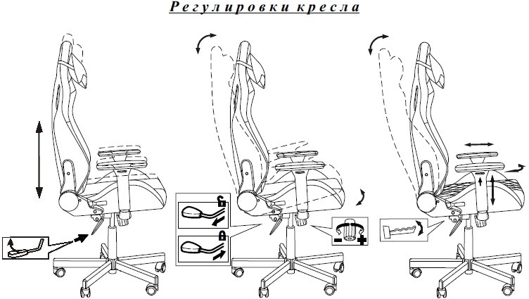 высоты (газлифт) , высоты подголовника, жесткости качания, положения подлокотников