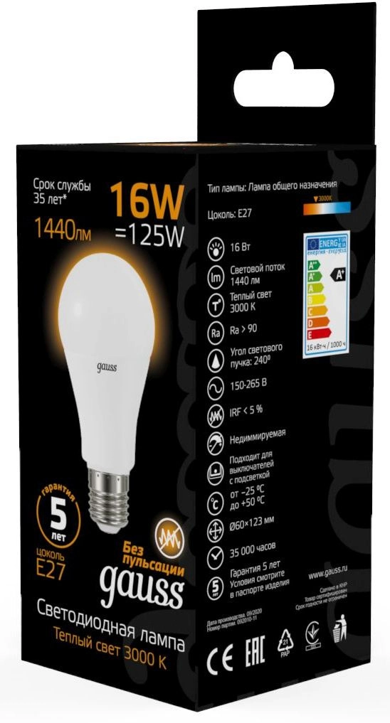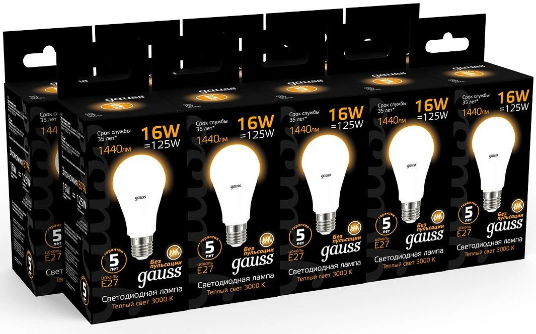 Лампа светодиодная Gauss 16Вт цок.:E27 шар 220B св.свеч.бел.теп. A60 (упак.:10шт) (102502116)