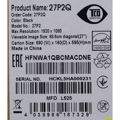 Монитор AOC 27" 27P2Q/01, 16:9, IPS, FHD, 4ms, 300cd, 75Hz, VGA, DVI, HDMI, DP, USB, HAS, SPK