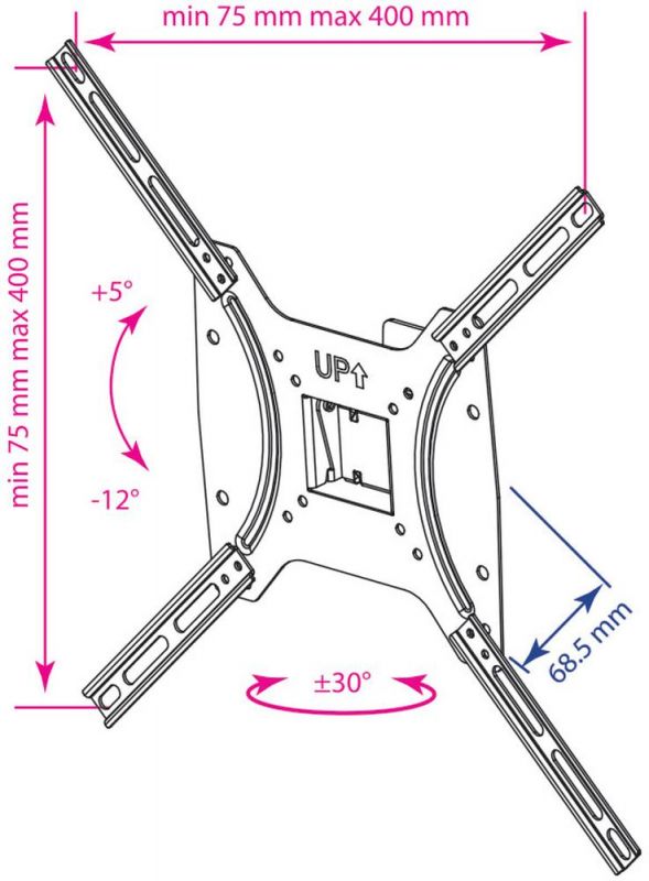 Крепеж Kromax OPTIMA-402 black (Кронштейн для LED/LCD телевизоров 15"-55", max 25 кг, настенный, 3 ст свободы, наклон +5°-12°, поворот ±30°, от стены 68.5 мм, max VESA 400x400 мм,) [28009]