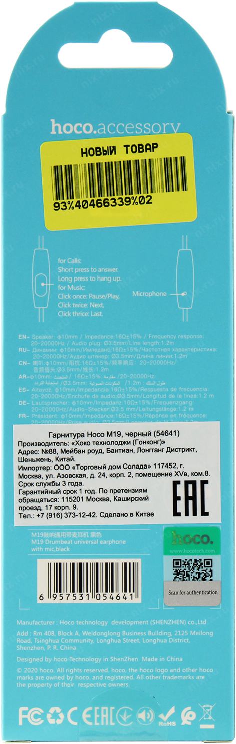 Наушники с микрофоном Hoco M19 Black (шнур 1.2м)