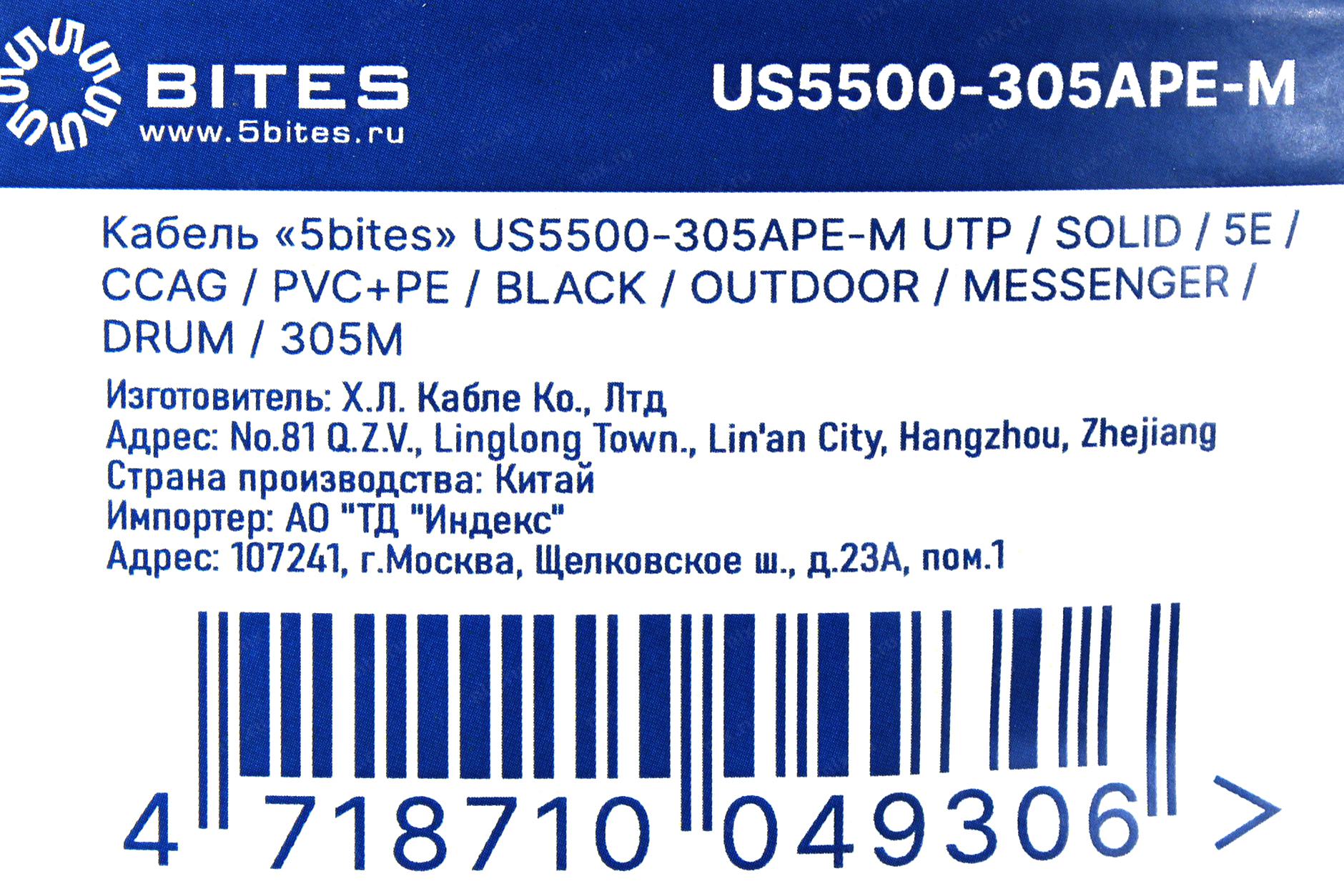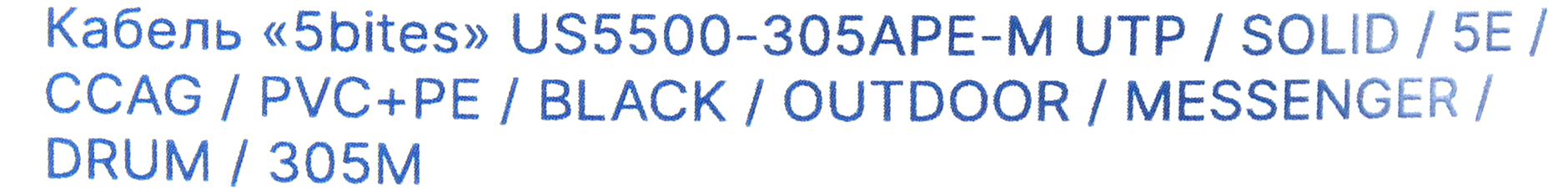Кабель 5bites Кабель US5500-305APE-M витая пара UTP/SOLID/5E/CCAG/PVC+PE/BLACK/OUTDOOR/MESSENGER/DRUM/305M