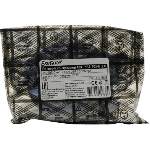Контроллер Exegate EX283714RUS Контроллер сетевой EXE-361 PCI-E 2.0, 3*USB3.0 ext + LAN UTP 1000Mbps, раз.доп.пит.OEM)