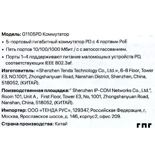 5 портов 10/100/1000 Мбит/сек, 4 из них с PoE PSE, 1 из них PoE PD