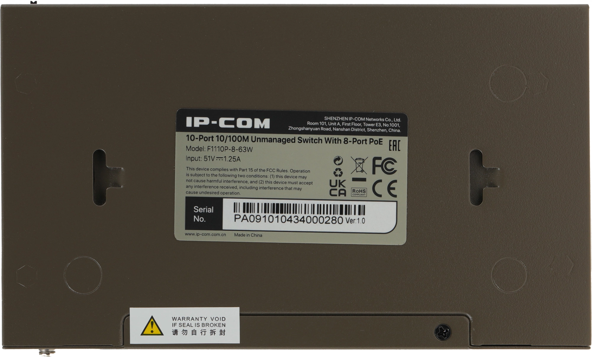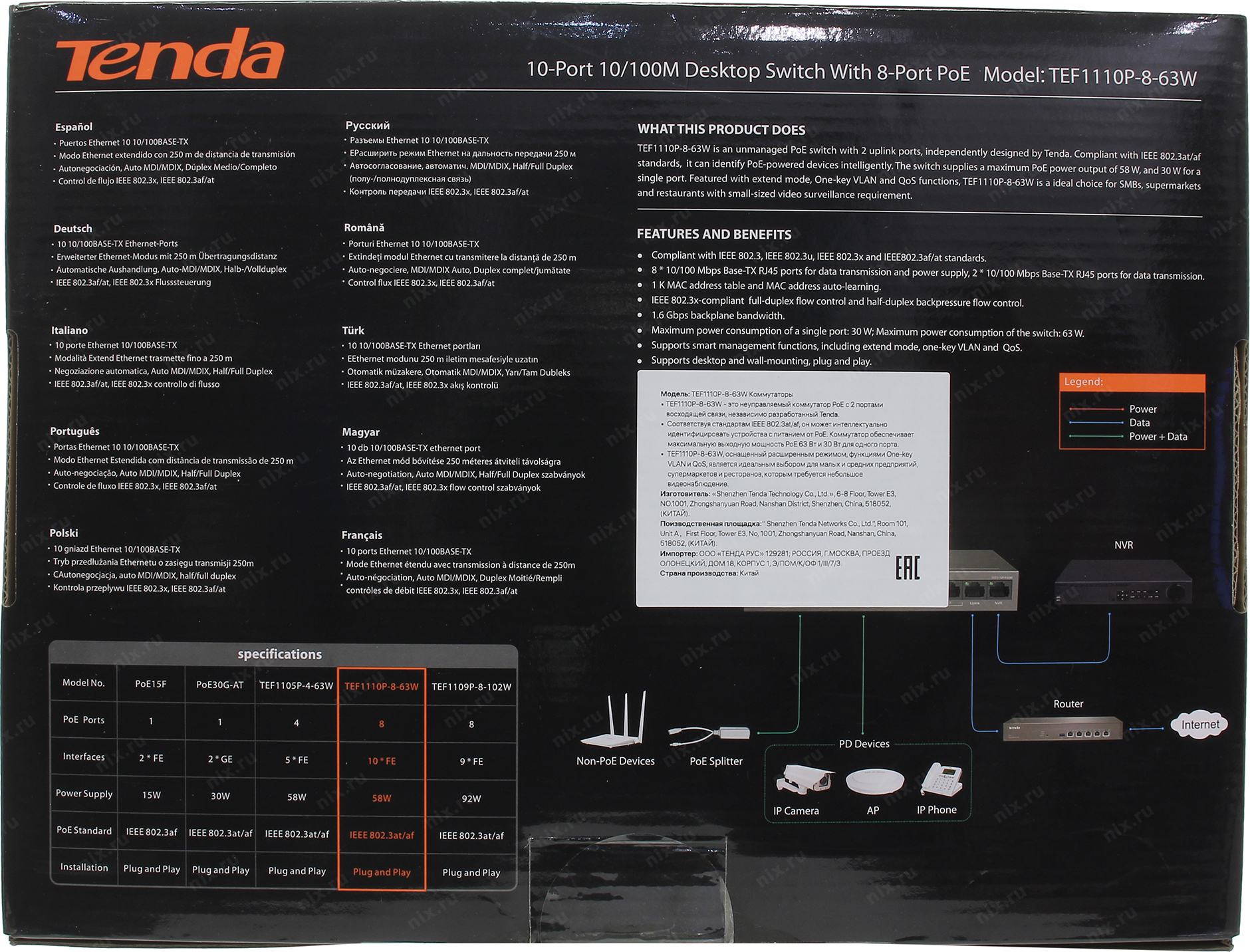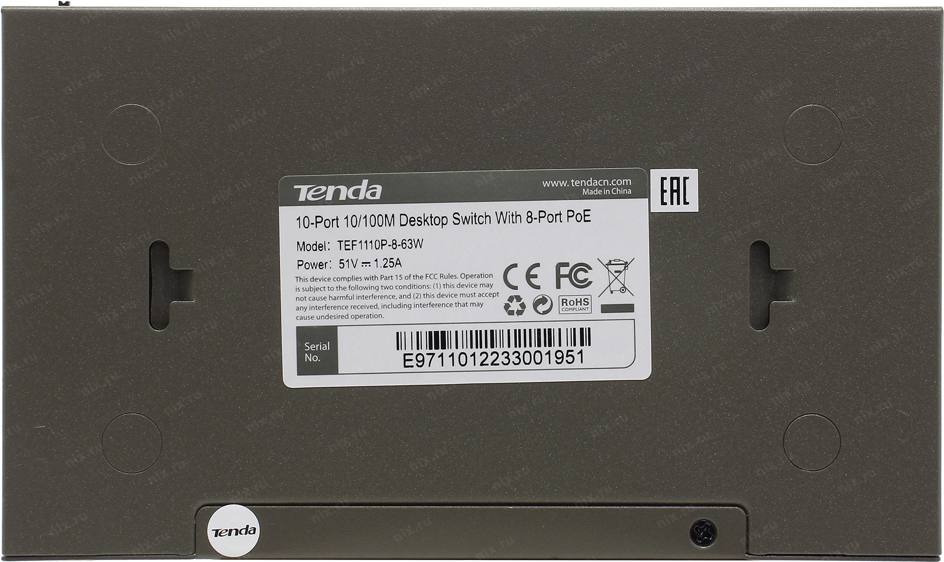 Коммутатор Tenda TEF1110P-8-63W (L2) 10x100Мбит/с 8PoE 58W неуправляемый