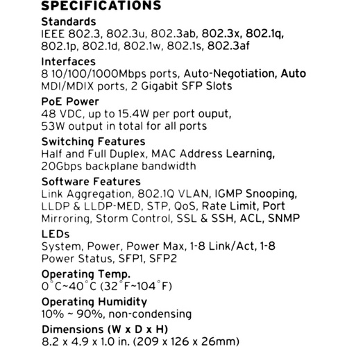 802.1d (Spanning Tree Protocol), 802.1p (QoS), 802.1Q (VLAN), 802.1s (MSTP), 802.1w (RSTP), 802.3u (Fast Ethernet), 802.3ab (1000BASE-T), 802.3ad (LACP), 802.3af (PoE), 802.3i (10BASE-T), 802.3x (Flow Control), 802.3z (Fiber Gigabit Ethernet)