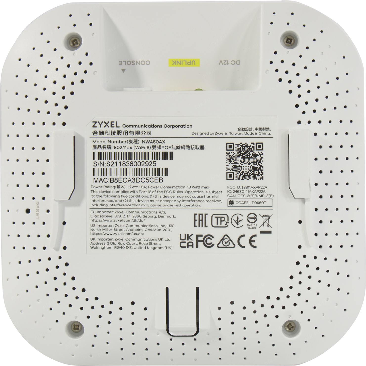 Точка доступа стандарта Wi-Fi 6 (802.11ax) NWA50AX с поддержкой PoE, быстрого роуминга 802.11r/k/v, WPA3 и централизованного управления Zyxel Nebula (nebula.zyxel.com).