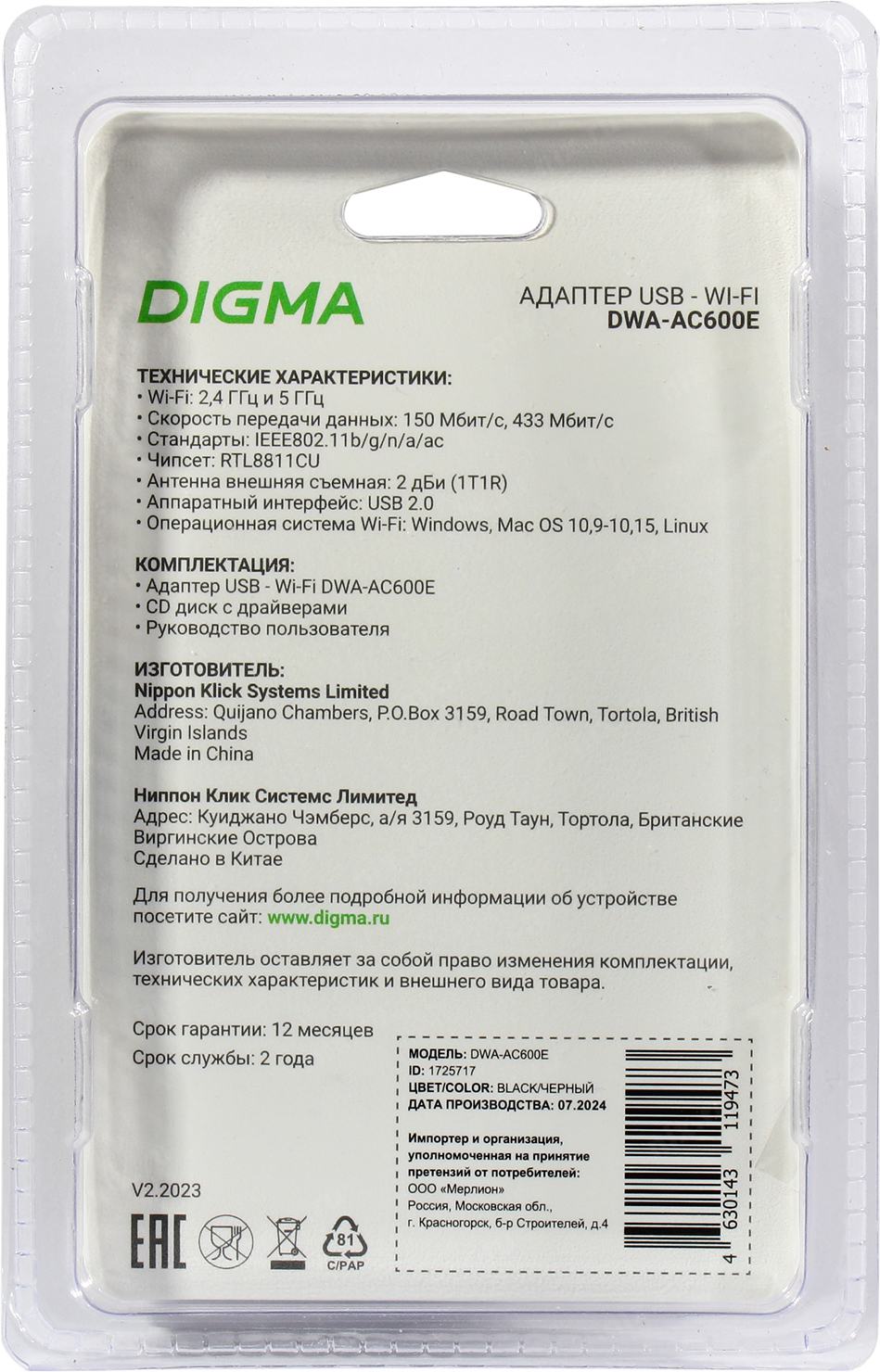 Сетевой адаптер Wi-Fi Digma DWA-AC600E AC600 USB 2.0 (ант.внеш.съем) 1ант.