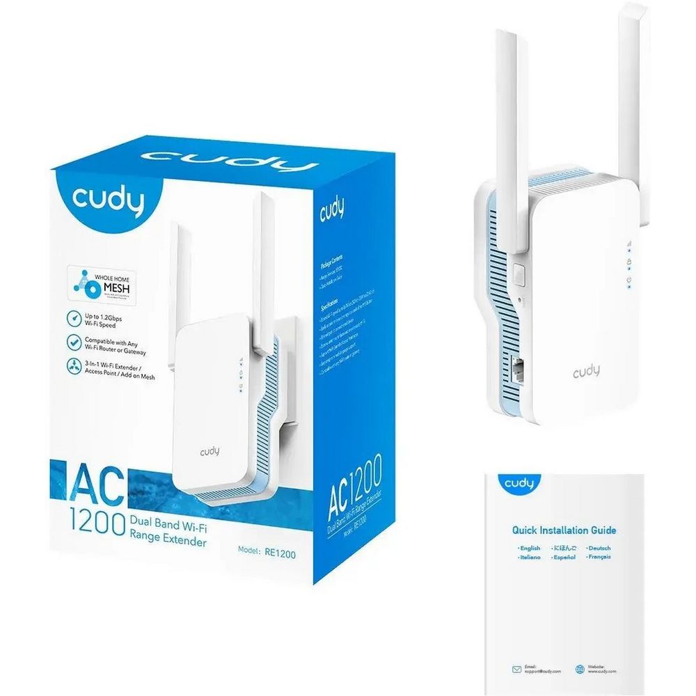 Усилитель Wi-Fi / RE1200 / AC1200 Wi-Fi Mesh Repeater, AP mode, Chipset MediaTek, Cudy Mesh Support, 867Mbps at 5GHz + 300Mbps at 2.4GHz, 802.11ac/a/b/g/n, 1 10/100Mbps Port, WPS button, Intelligent Signal Light, Access Control, LED control, Cudy APP.