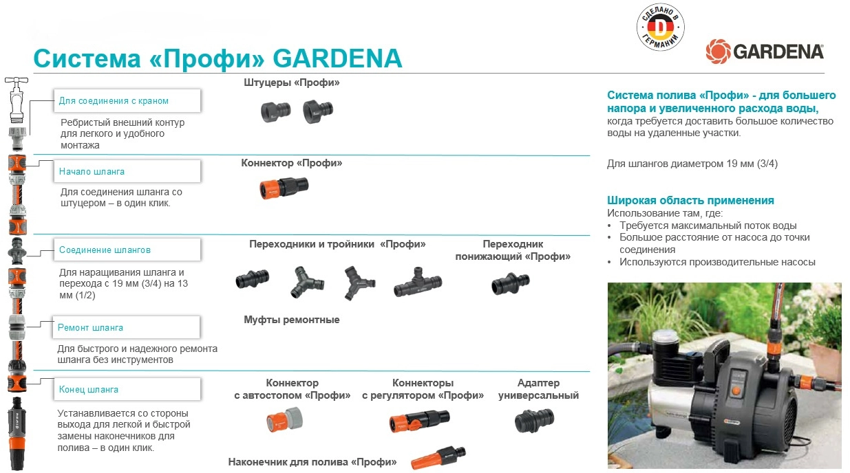Переходник понижающий " Профи" Maxi-Flow GARDENA оптимально подходит для подсоединения к шлангам в целях их наращивания, а также для использования с насосами. Переходник предназначен для перехода от системы " Профи" Maxi-Flow GARDENA к системе Базовой Системе полива GARDENA.