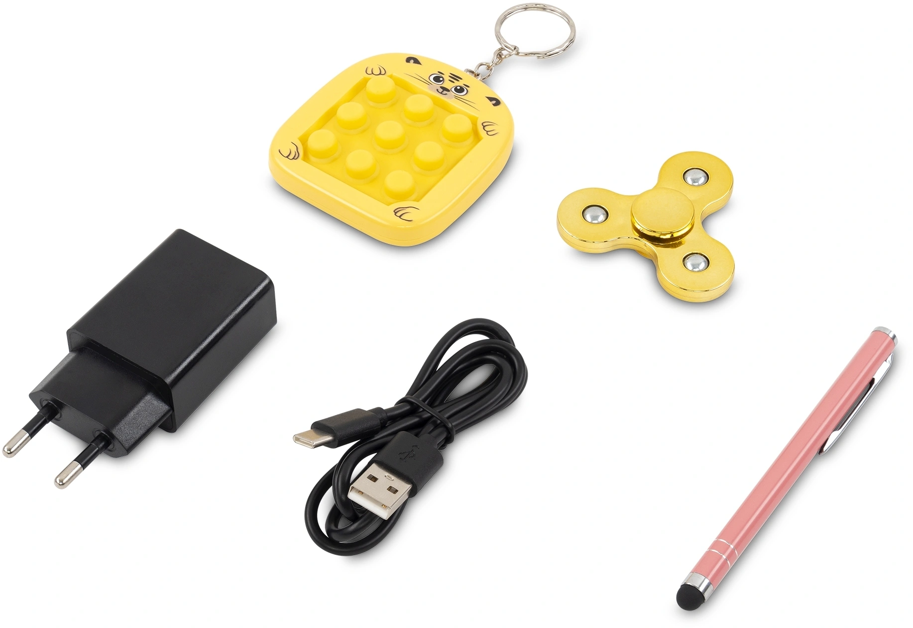 Сетевой адаптер питания; USB-C кабель; набор наклеек; стилус; спиннер; поп-ит игрушка