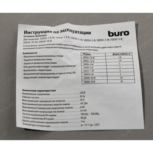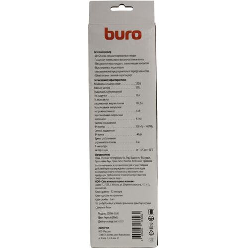 Сетевые фильтры BURO Сетевой фильтр, 5 розеток, 1.8 метра, (500SH-1.8-B), черный (коробка) (992289)