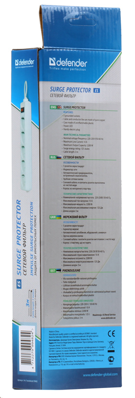 Сетевые фильтры Defender Фильтр ES, 3.0м Коробка 5 розеток белый [99482]