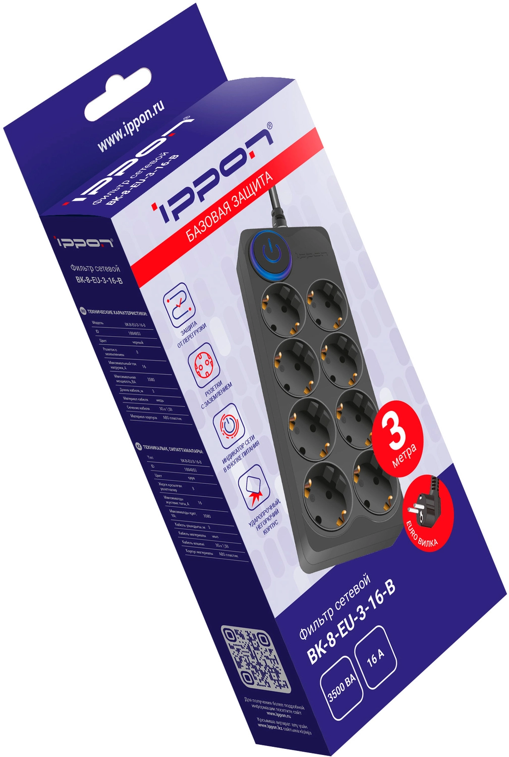 Сетевой фильтр Ippon BK-8-EU-3-16-B 3м (8 розеток) черный (коробка)