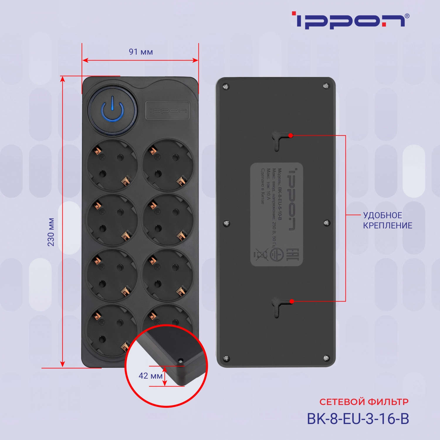 Сетевой фильтр Ippon BK-8-EU-3-10-B 3м (8 розеток) черный (коробка)
