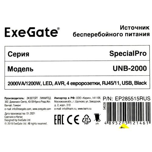 ИБП Exegate EP285515RUS ИБП ExeGate SpecialPro UNB-2000.LED.AVR.EURO.RJ.USB <2000VA/1200W, LED, AVR, 4 евророзетки, RJ45/11, USB, Black>