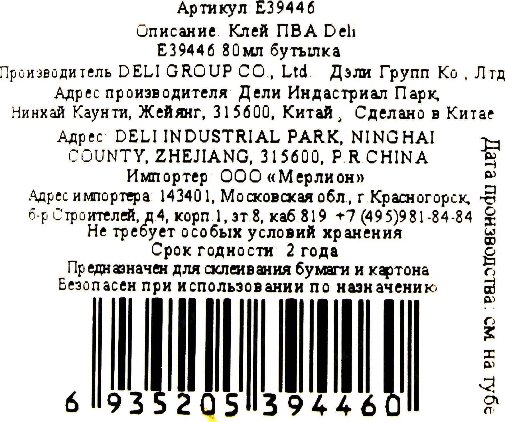 Расх. материал Deli < E39446> Клей ПВА (80мл)