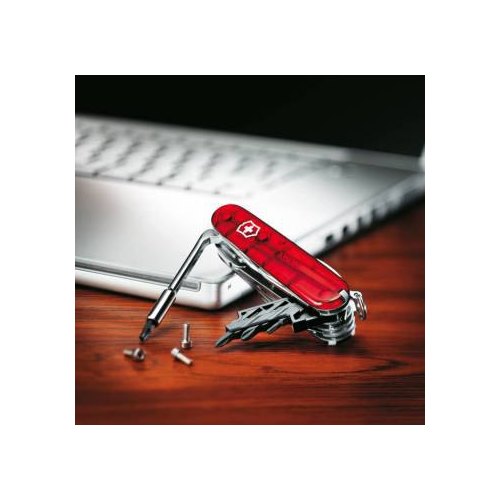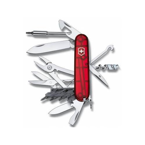 большое лезвие, малое лезвие, штопор, Консервный нож, Отвертка, открывалка для бутылок с отверткой - инструментом для снятия изоляции, шило, кернер, кольцо для ключей, пинцет, зубочистка, ушко для шитья, шариковая ручка, инструмент для переключения DIP-переключателей,