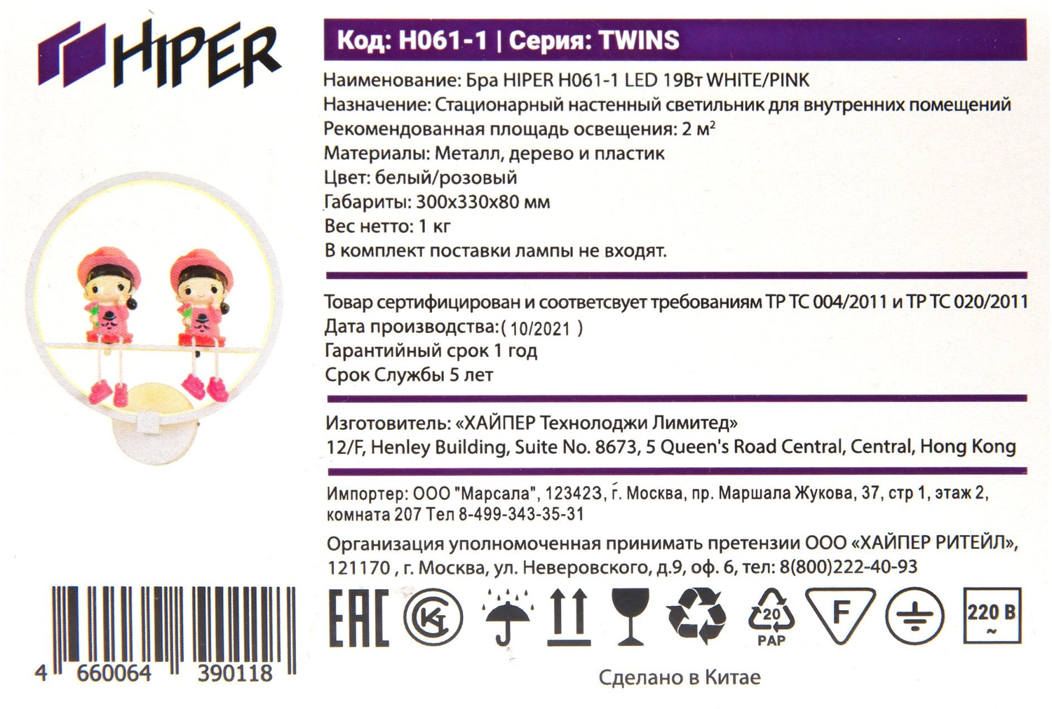 Светильник Hiper Twins H061-1 19Вт 4000K цв.св.:белый нейтральный розовый/ белый