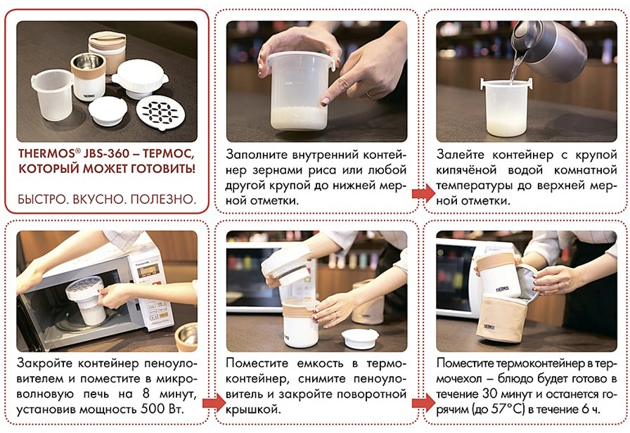 Пока вы едете на работу, в вашей сумочке будет готовиться рис! В термосе серии JBS рис можно готовить практически без вашего участия - достаточно предварительно поместить внутреннюю емкость с зернами, залитыми водой, в микроволновую печь на 8 минут, затем накрыть крышкой и поставить в термоконтейнер